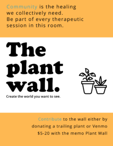 1. Bring in a plant that can hang or trail. OR Send Venmo with $1-$20 with the note Plant Curtain. Some ideas for plants can be found here.